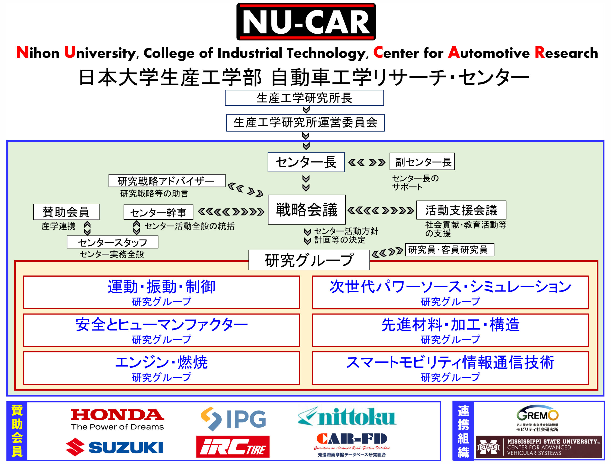 日本大学生産工学部自動車工学リサーチ・センターは、活動方針などを決定する「戦略会議」、社会貢献活動などの支援を行う「活動支援会議」および研究分野に応じて組織された6つの「研究グループ」で構成されています。この他、社会の要請に即応するため、「特設研究グループ」が活動期間を限定し組織されます。戦略会議では各研究グループの情報交換を行い、グループ間の連携を密にしています。さらに、NU-CARの活動目的を理解し事業遂行の支援に賛同された企業・団体(賛助会員)とも連携し、自動車工学のさらなる発展を目指して活動しています。組織の詳細はセンター内規をご覧ください。 構成員は、以下の通りです。戦略会議メンバーは「◎」、活動支援会議メンバーは「○」を付記しています。